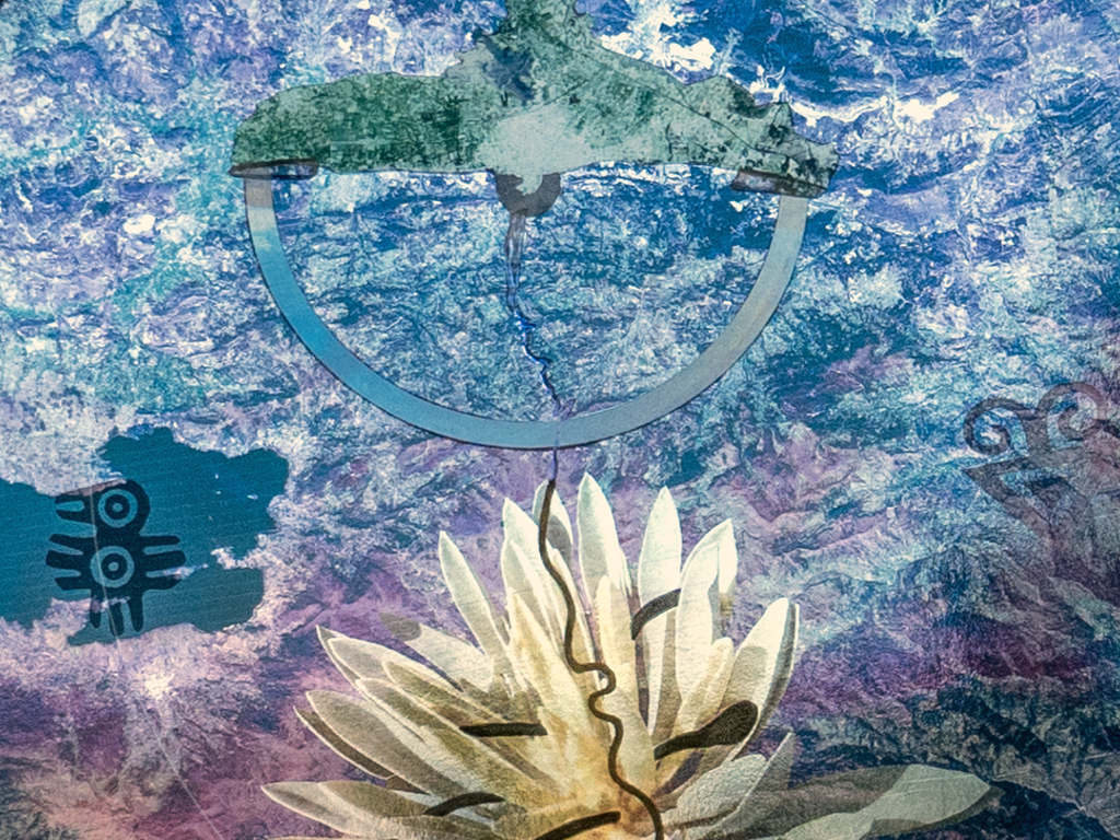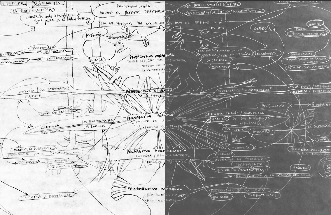 At the end of the residency, Erin Turner gathered some of her findings in a diagram of perspectives and a collage about the Monquirá River. The diagram (see above) collects the viewpoints from which she approached the river. The collage, titled Hummingbird Peak, gathered a Muisca legend under which Sogamoso (Sugamuxi) takes the shape of a hummingbird, with its wings formed by the mountains on either side of the city and the water flowing down the Monquirá River as the nectar that nourishes this urban bird.